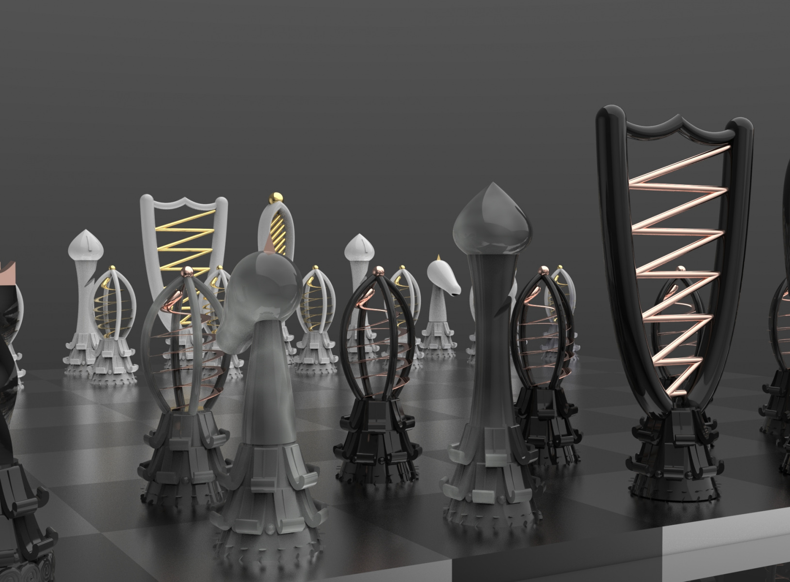 I drew from the art style by using gold accents on most of my pieces. I also gave each piece a decorative base such as that of many pillars made during this time. I gave the chess board itself a sleek, shiny texture with no border to add to the elegance.